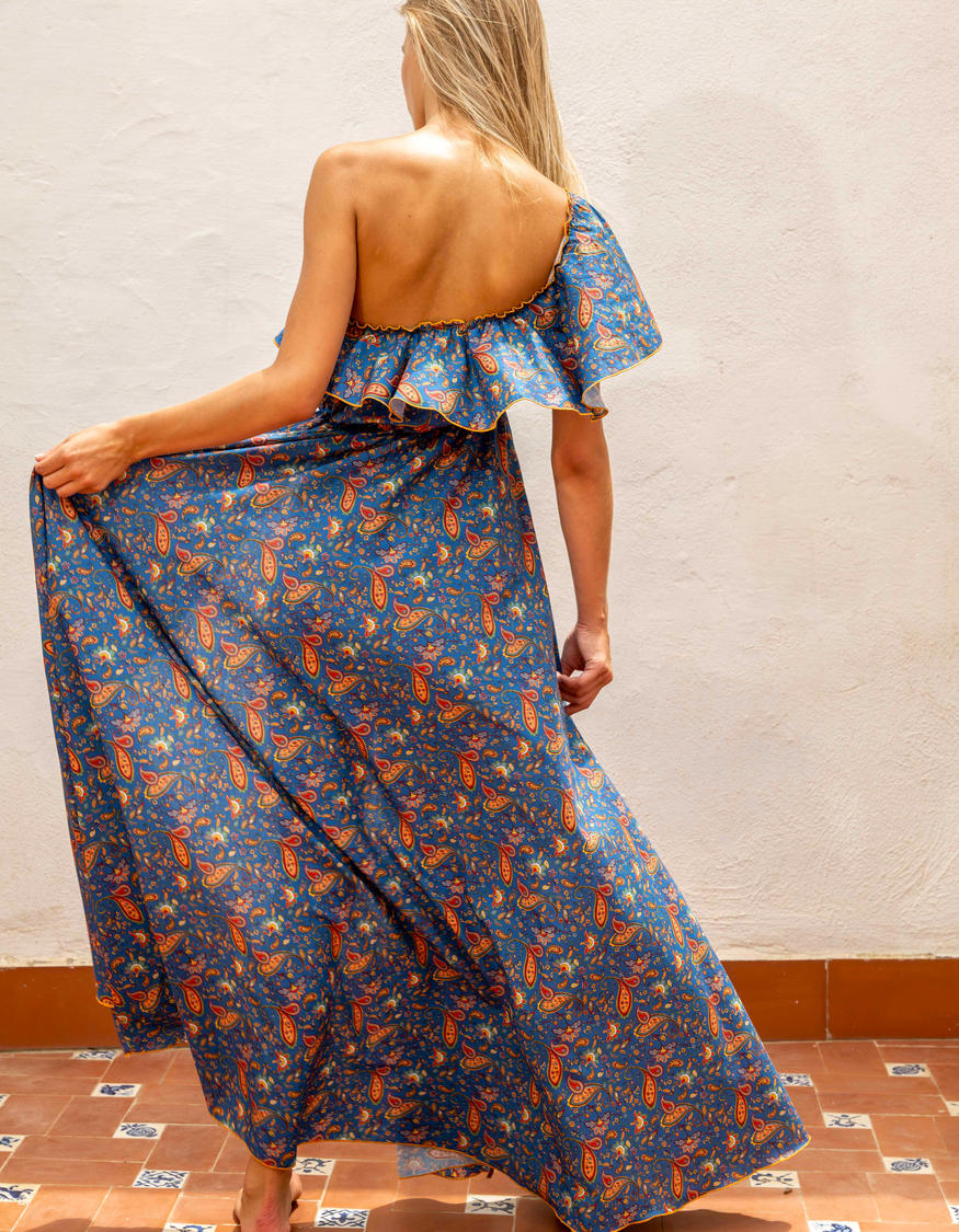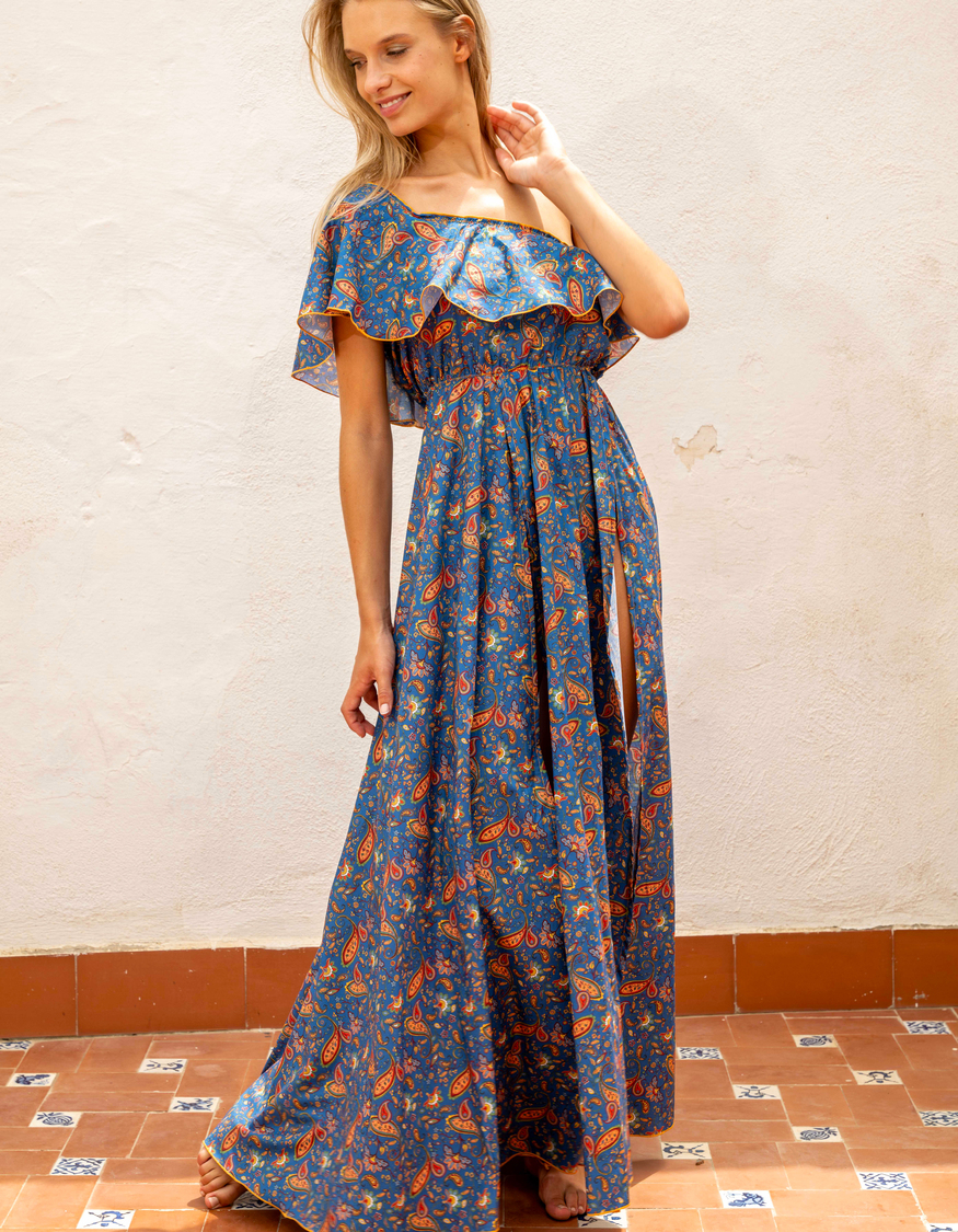 Maxi dress 100% cotton. Cashmere blue fabric.