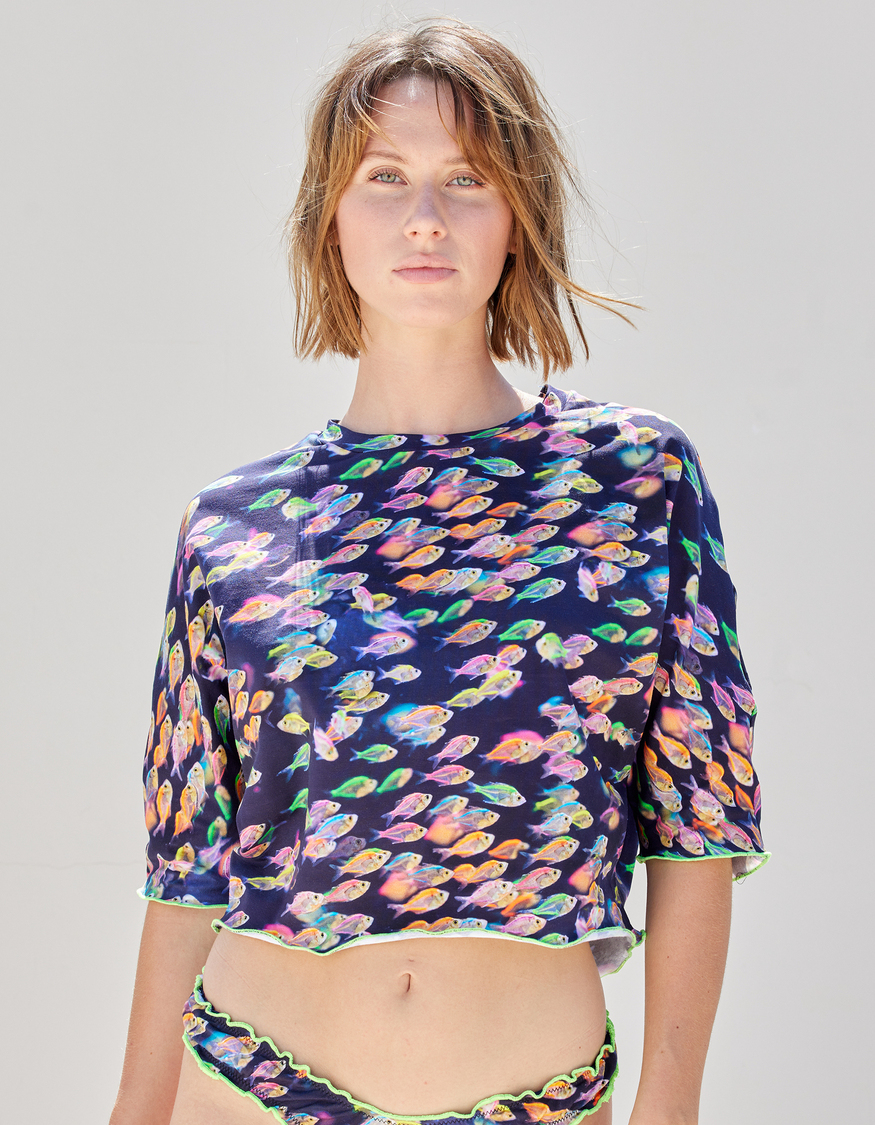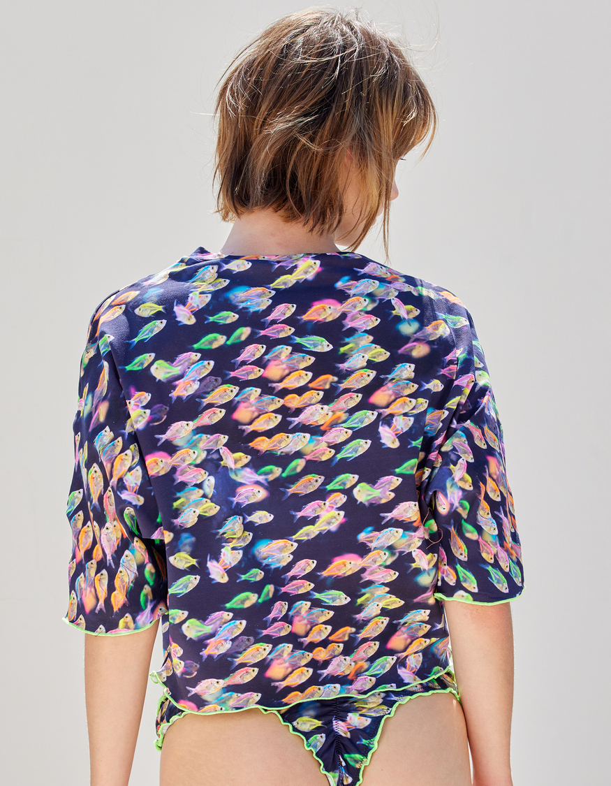 Camiseta de tejido elastico 100% algodón de estampado de peces en tonos fluor.